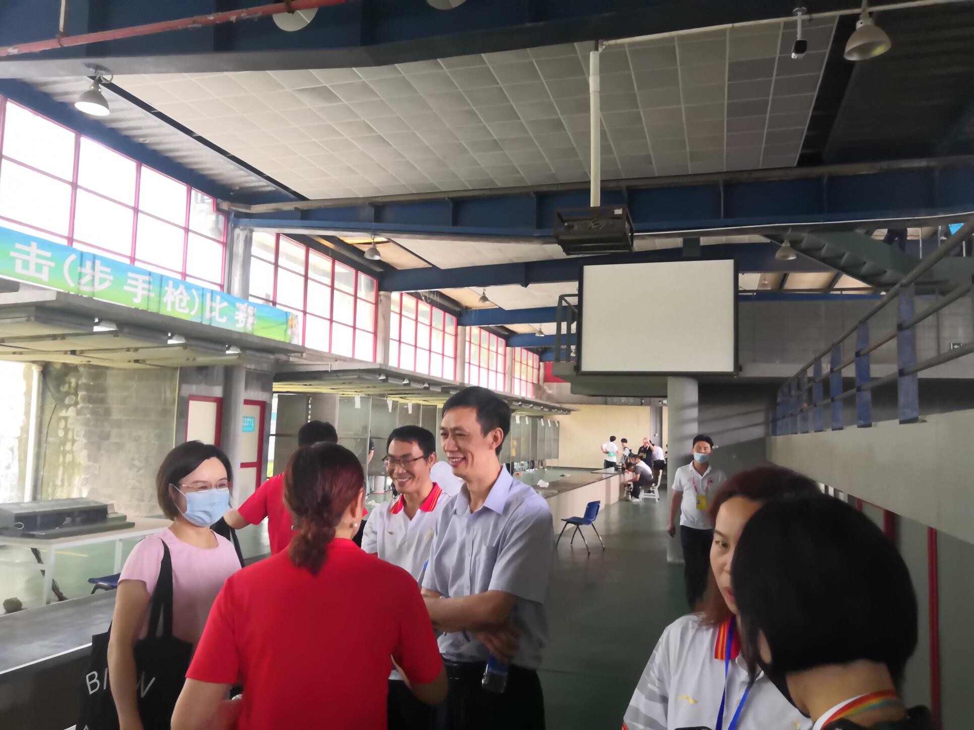 丁宁涛所长、吴猛副所长与科研人员许瑞平在省运会射击项目赛场