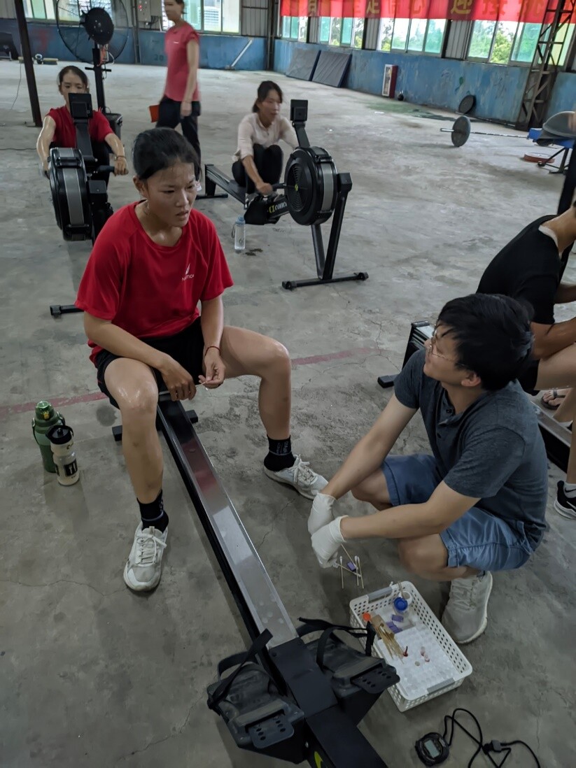 (图二 体科所科研人员招启文为赛艇队员进行心率和血乳酸测试)