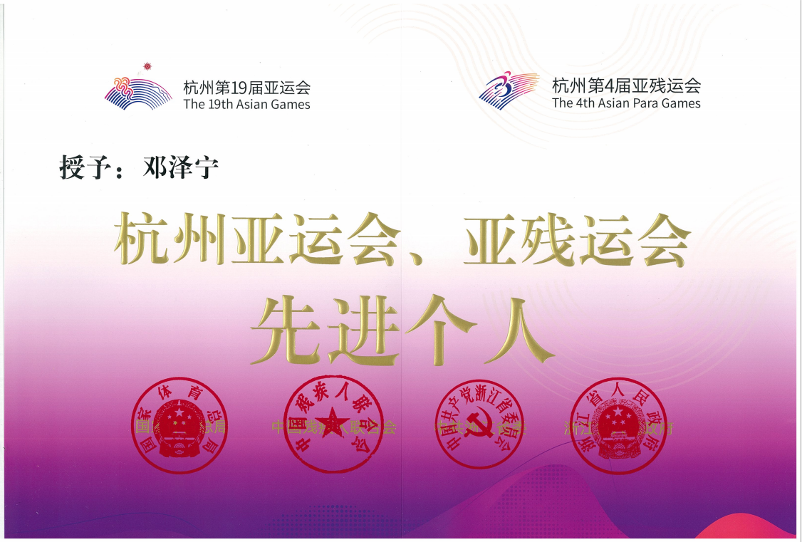 近日,原广州市体育场馆设施建设中心副主任邓泽宁同志荣获由国家体育总局、中国残疾人联合会、中国共产党浙江省委员会、浙江省人民政府联合颁发的“杭州亚运会、亚残运会先进个人”称号,以表彰其在服务杭州亚运会、亚残运会期间恪尽职守、无私奉献,始终保持一名共产党员的本色,以强烈的政治自觉、思想自觉、行动自觉,积极做好各项工作,确保赛事安全顺利圆满举行。