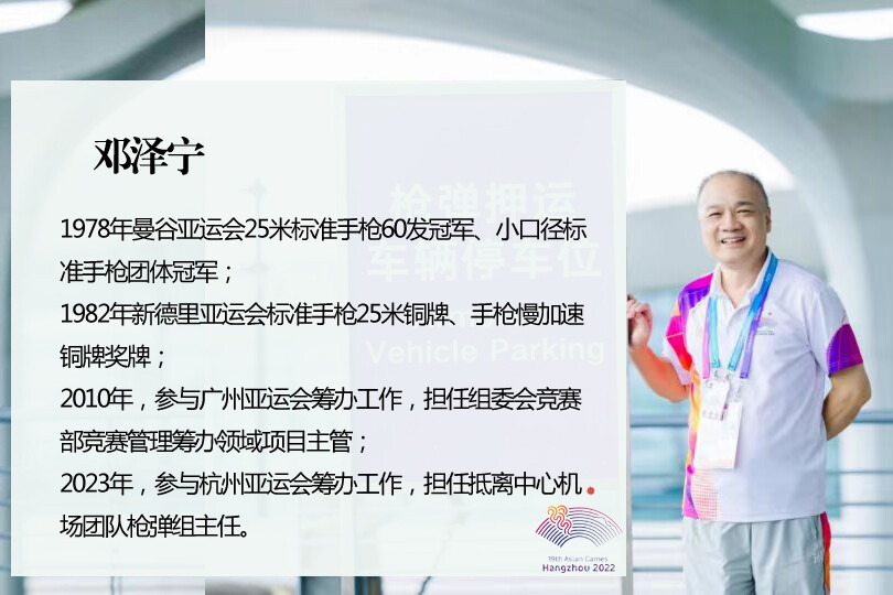 2023年6月,经组织协调,邓泽宁同志前往第19届亚运会组委会、杭州第4届亚残运会工作,先后担任富阳银湖体育中心场馆运营团队竞赛副指挥长助理、竞赛技术运行主任(飞碟),后被抽调到杭州亚组委亚残组委抵离指挥中心——萧山机场团队担任枪弹组主任。