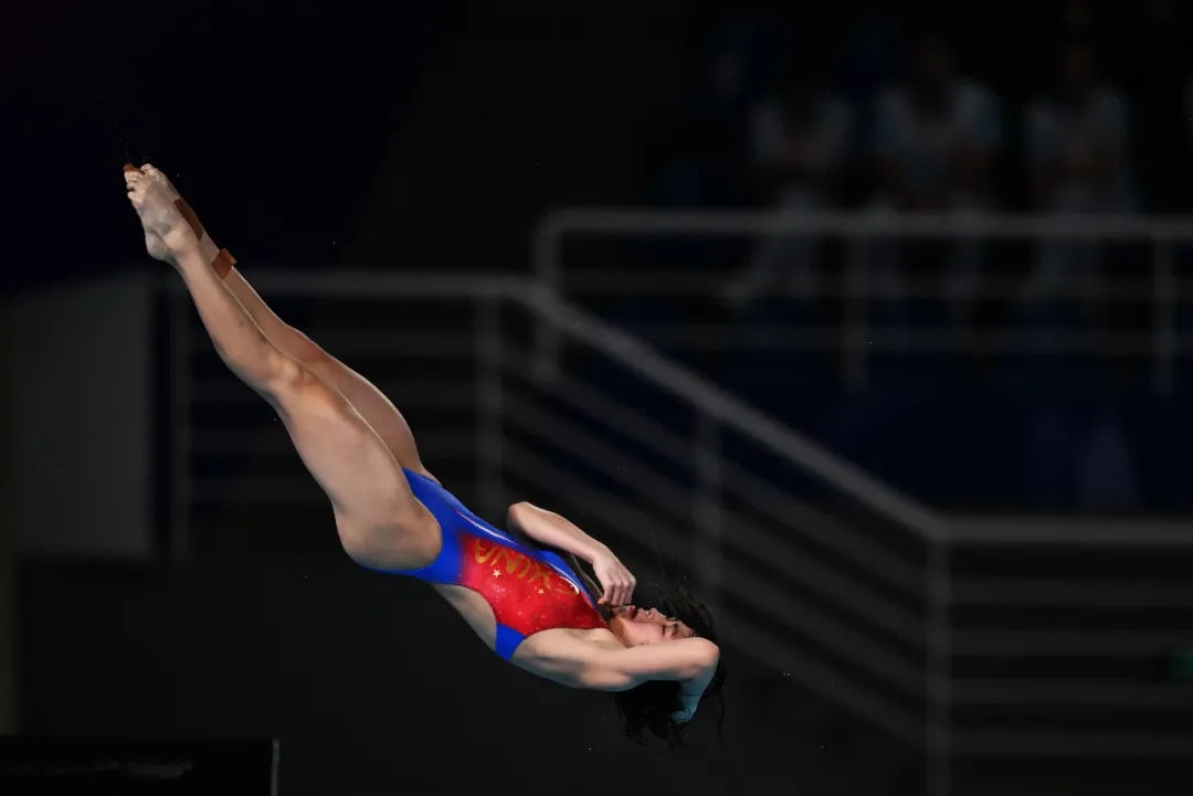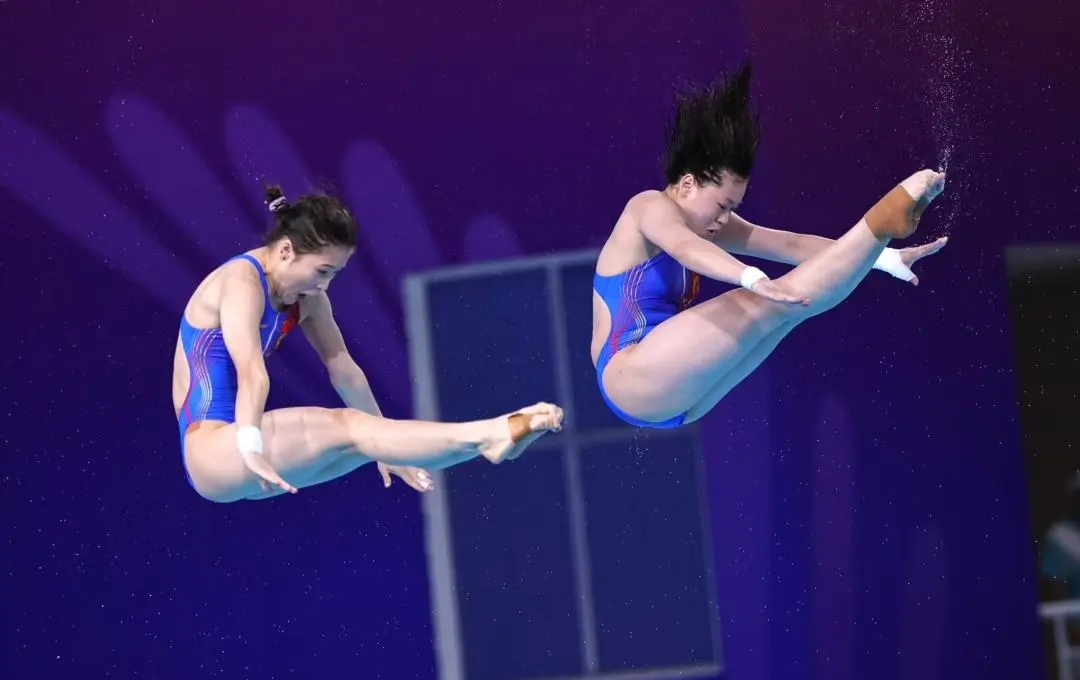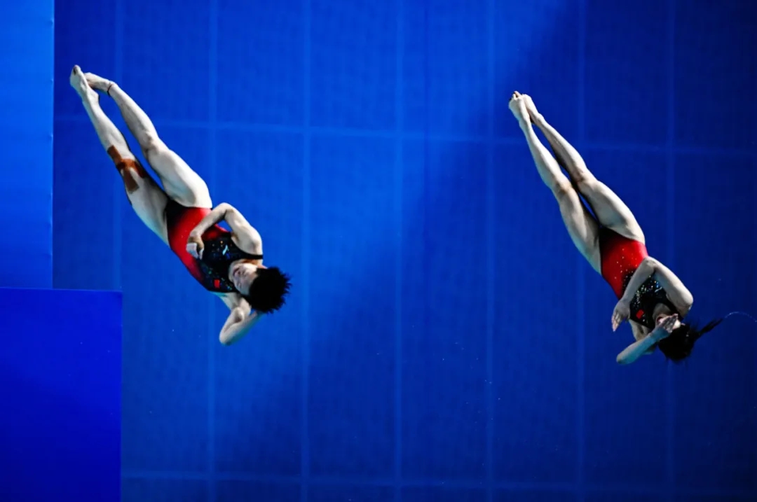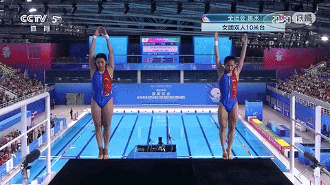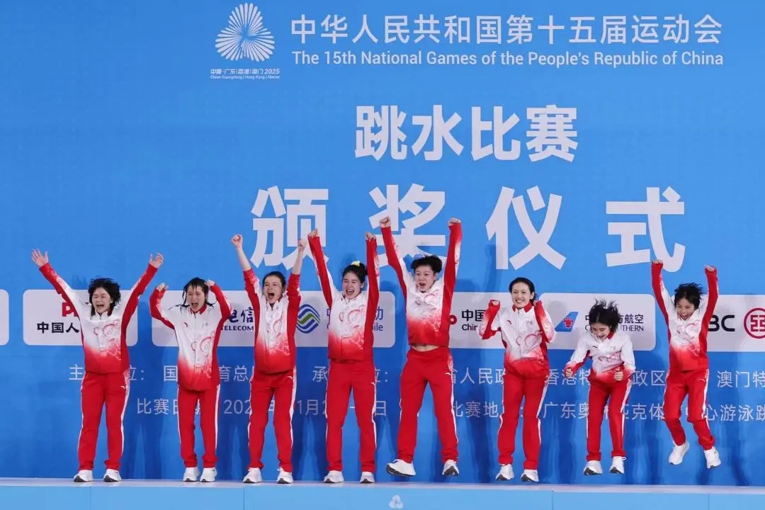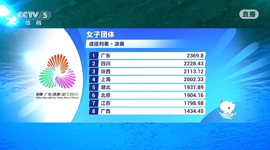 广东队以2369.8分成功卫冕女子团体冠军 这也是广东跳水队第5次 赢得全运会女子团体冠军 团体决赛的成绩 由单、双人的10米台、3米板 共4个分项的得分相加决出 各参赛队伍每个分项 派出两名(对)选手参赛 在女子团体10米跳台比赛中 广东队王伟莹和谢佩铃 获得第一和第三 谢佩铃 在女子团体双人10米跳台比赛中 全红婵和王伟莹 以235.86的成绩拿下第一 王伟莹和全红婵(右)在比赛中