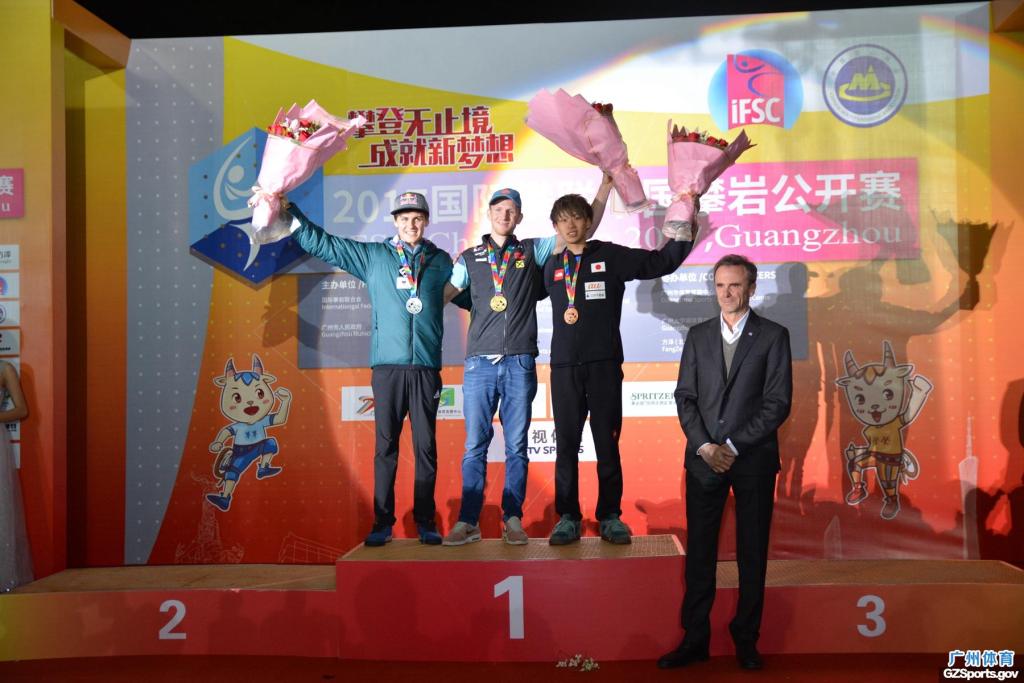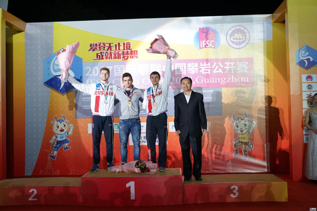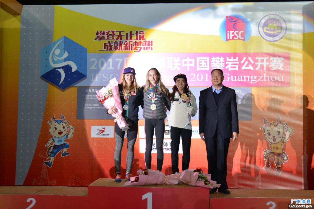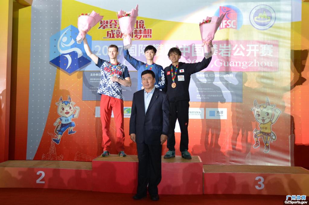 11月19日, 由国际攀岩联合会、广州市人民政府主办,国家体育总局登山运动管理中心、中国登山协会、现场比分 承办,广州市体育竞赛中心、广州大学城体育中心协办的2017国际攀联中国攀岩公开赛精彩圆满在广州大学城体育中心攀岩场落下帷幕。组委会主任、国家体育总局登山运动管理中心主任、中国登山协会主席李致新, 广东省体育局局长王禹平,组委会常务副主任、广州市政府副秘书长张建华,组委会常务副主任、现场比分 局长罗京军和国际攀联主席马尔科等为6个项目获得前三名的运动员颁奖。