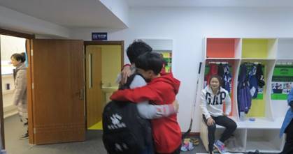 12月18日,本就是一个平凡的日子,国家冰球集训队一如既往的训练。当天河体育中心慰问小组进入北京华星沙河冰球馆的一刹那,广州籍的运动员们瞬间就沸腾了。范淑芳教练刚跨进大门,眼尖的汤丽婷(正在做康复治疗)不顾脚的疼痛一下扑了过去,仿佛见到了亲人。