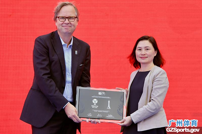 随后,弗兰克·林德斯代表国际篮联向广州赛区组委会授予主办城市牌匾。广州市政府周玉梅副秘书长代表广州赛区接受了国际篮联颁发的象征着赛区身份和荣誉的主办城市牌匾。作为回礼,广州向国际篮联赠送了具有城市特色的广绣工艺品。