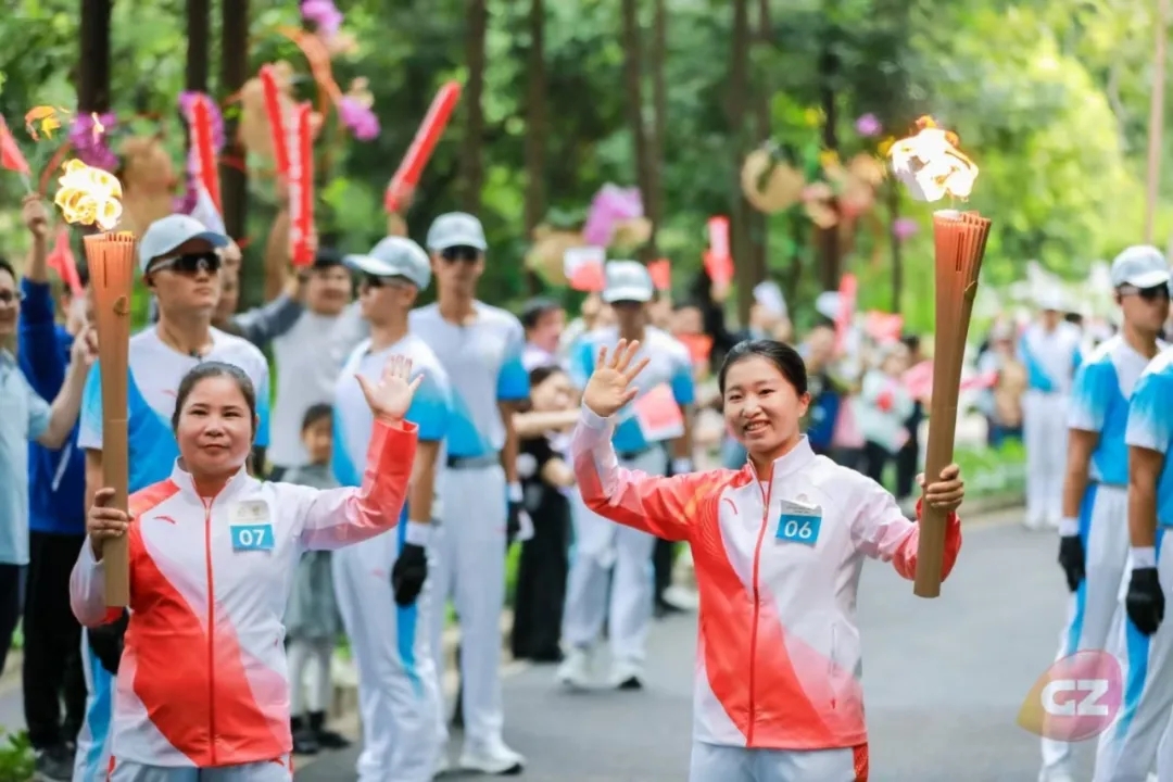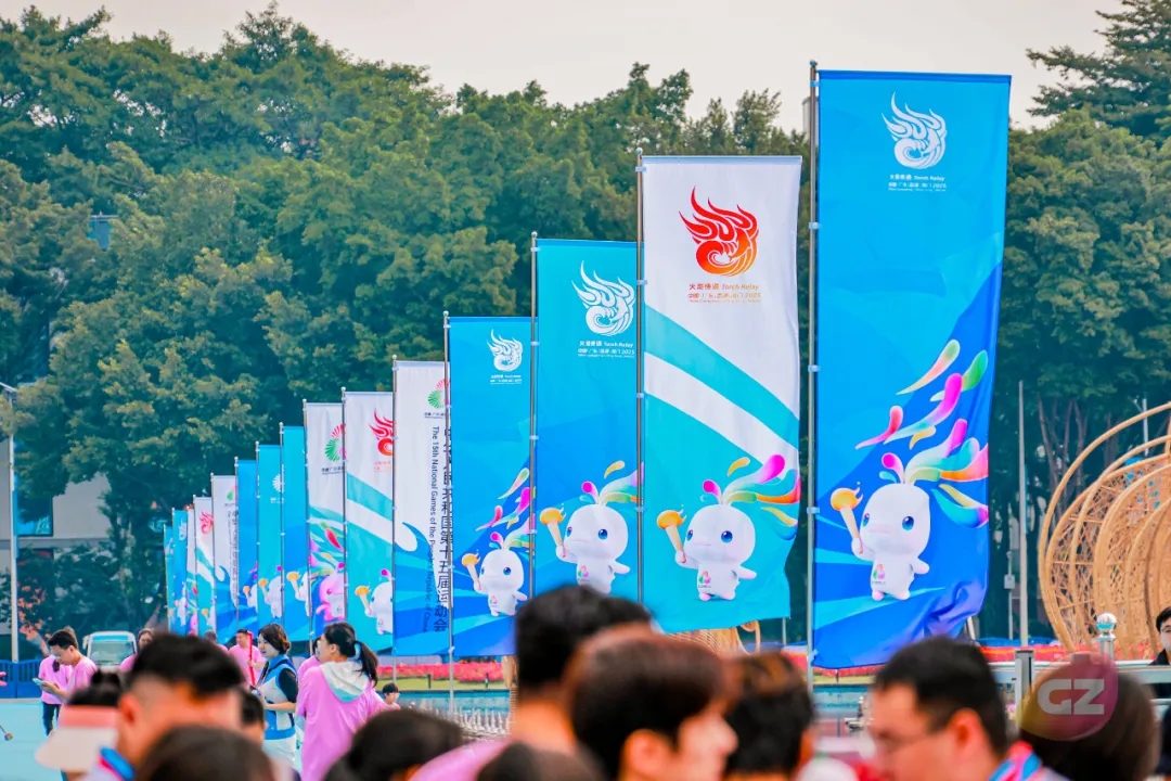 在五羊石像广场,本届赛会的吉祥物“喜洋洋”与“乐融融”,与火炬手进行一场跨越次元的接力,活力四射的啦啦操与古老的五羊传说奇妙交融。