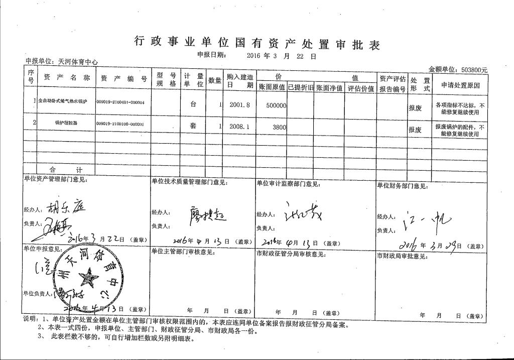 广州天河体育中心游泳馆2000年购置全自动卧式烯气热水锅炉和锅炉程控器(合计账面价值50.38万元),现因该资产已达到可更新年限且安全系数不达标存在事故隐患,经广州市质量监督局通知停用。为加强国有资产管理,确保资产安全有效使用,广州天河体育中心申请对资产作报废处置,现根据《广州市市属行政事业单位国有资产处置办法》(穗财资〔2012〕327号)有关规定予以公示,如有疑问请向市体育局计划财务处反映。
