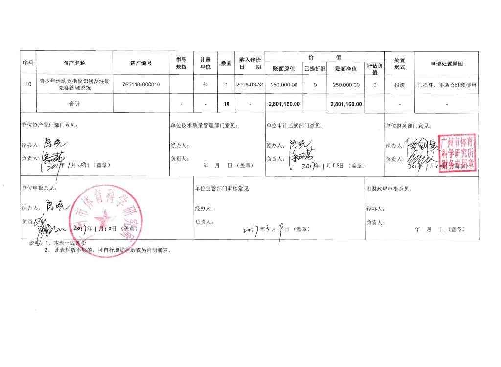 为加强国有资产管理,保证资产安全有效使用,广州市体育科学研究所申请对一批体质监测专用设备作报废处置,报废资产账面价值2,801,160元(详见附件),现根据《广州市市属行政事业单位国有资产处置办法》(穗财资〔2012〕327号)有关规定予以公示,如有疑问请向市体育局计划财务处反映。