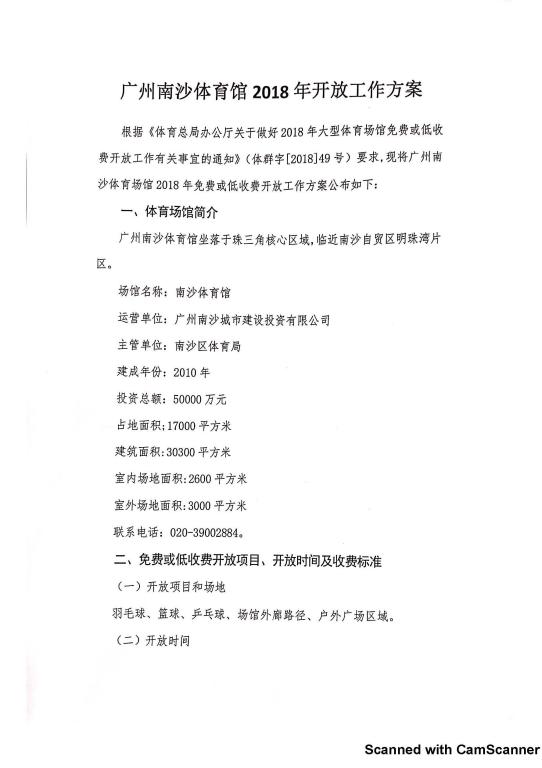 中央财政资金补助的体育场馆2018年开放工作方案(广州南沙体育馆)