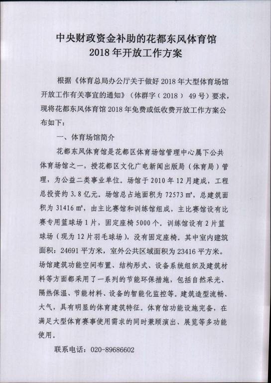 中央财政资金补助的体育场馆2018年开放工作方案(花都东风体育馆)