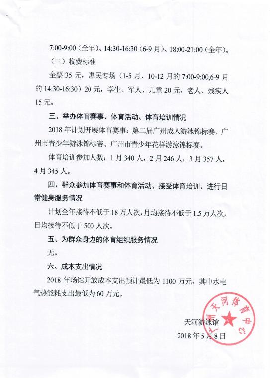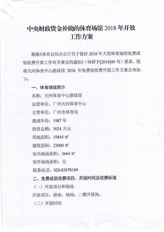 中央财政资金补助的体育场馆2018年开放工作方案(天河游泳馆)