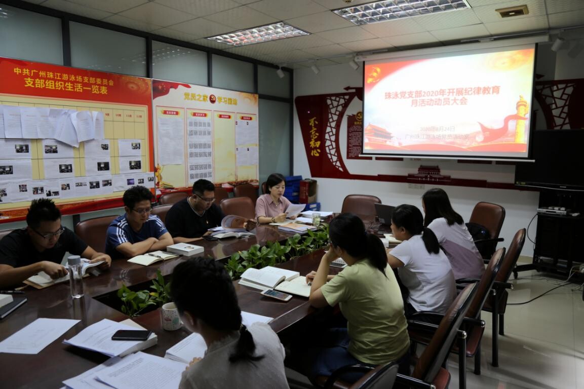 为深入学习贯彻习近平新时代中国特色社会主义思想,推动全面从严治党向纵深发展,进一步引导全体党员坚守政治忠诚、增强纪律意识,8月24日下午,广州珠江游泳场党支部在党员活动室召开2020年“纪律教育月”活动动员大会,在职党员、预备党员、入党积极分子共12人参加。