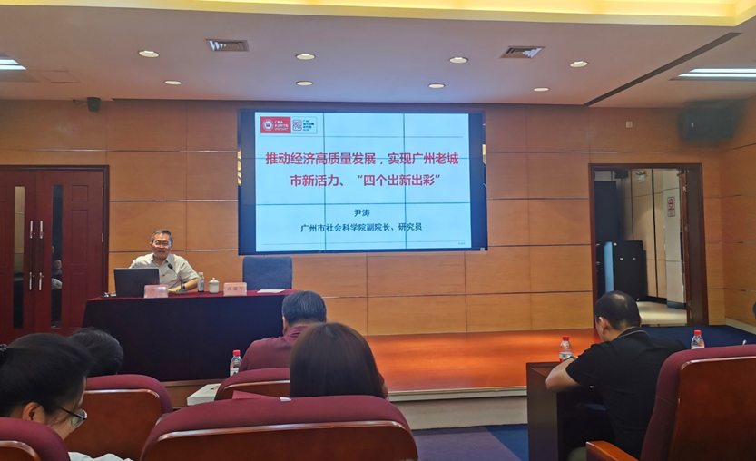 尹副院长以《推动经济高质量发展,实现广州老城市新活力、“四个出新出彩”》为题作了一个系统全面、准确精彩的宣讲报告。报告从习近平新时代中国特色社会主义经济思想“七个坚持”的内容展开阐述。尹副院长重点讲解“推动经济高质量发展”核心思想,他以丰富的经济领域研究经验,深入分析了广州经济发展情况。他归纳了广州近40年的经济发展轨迹,分析了广州未来优化产业空间布局的战略思路,详细列举了广州未来产业的选择,提出了广州推动经济高质量发展的三大动力机制:新产业、新空间和新文化。