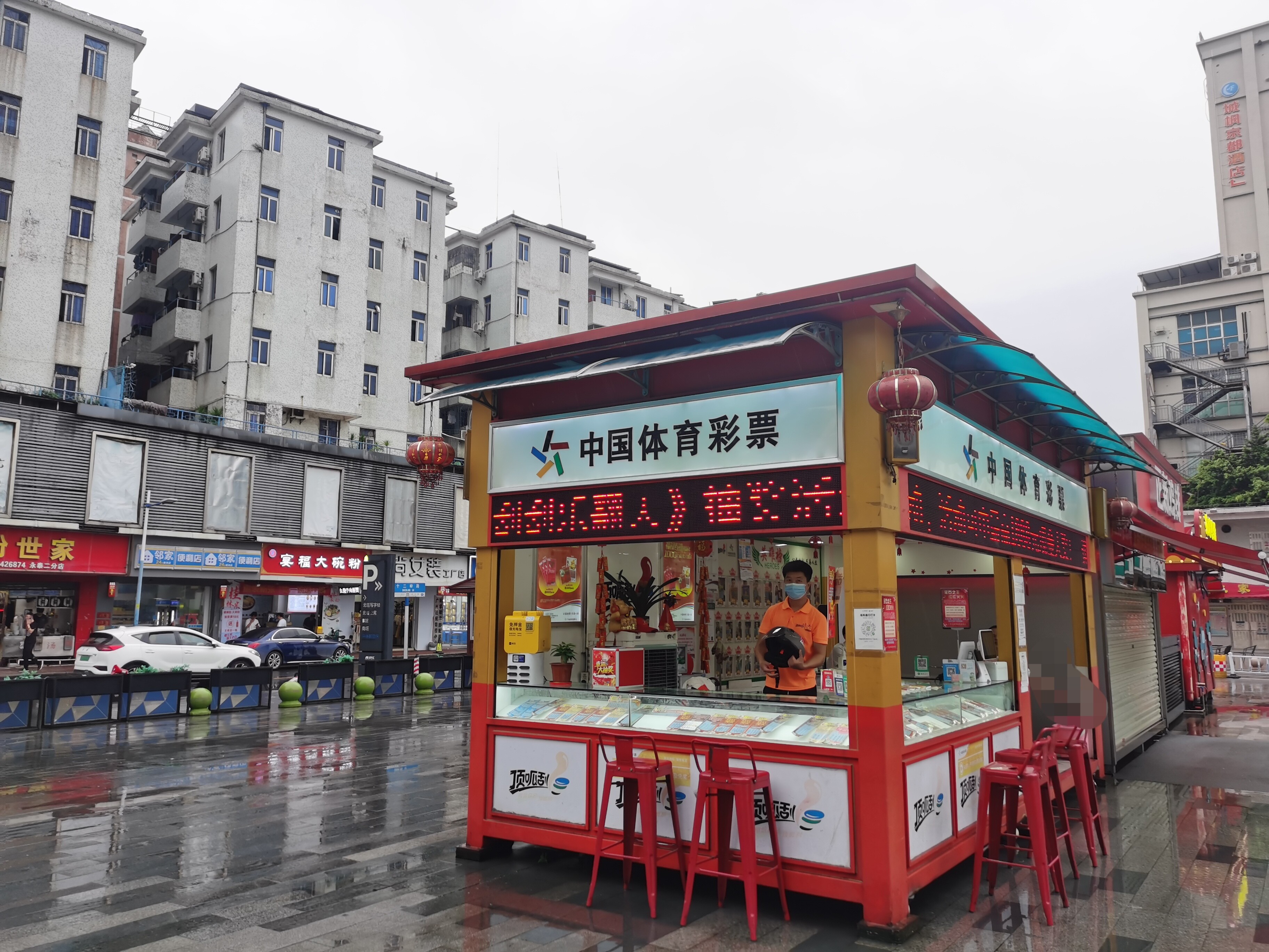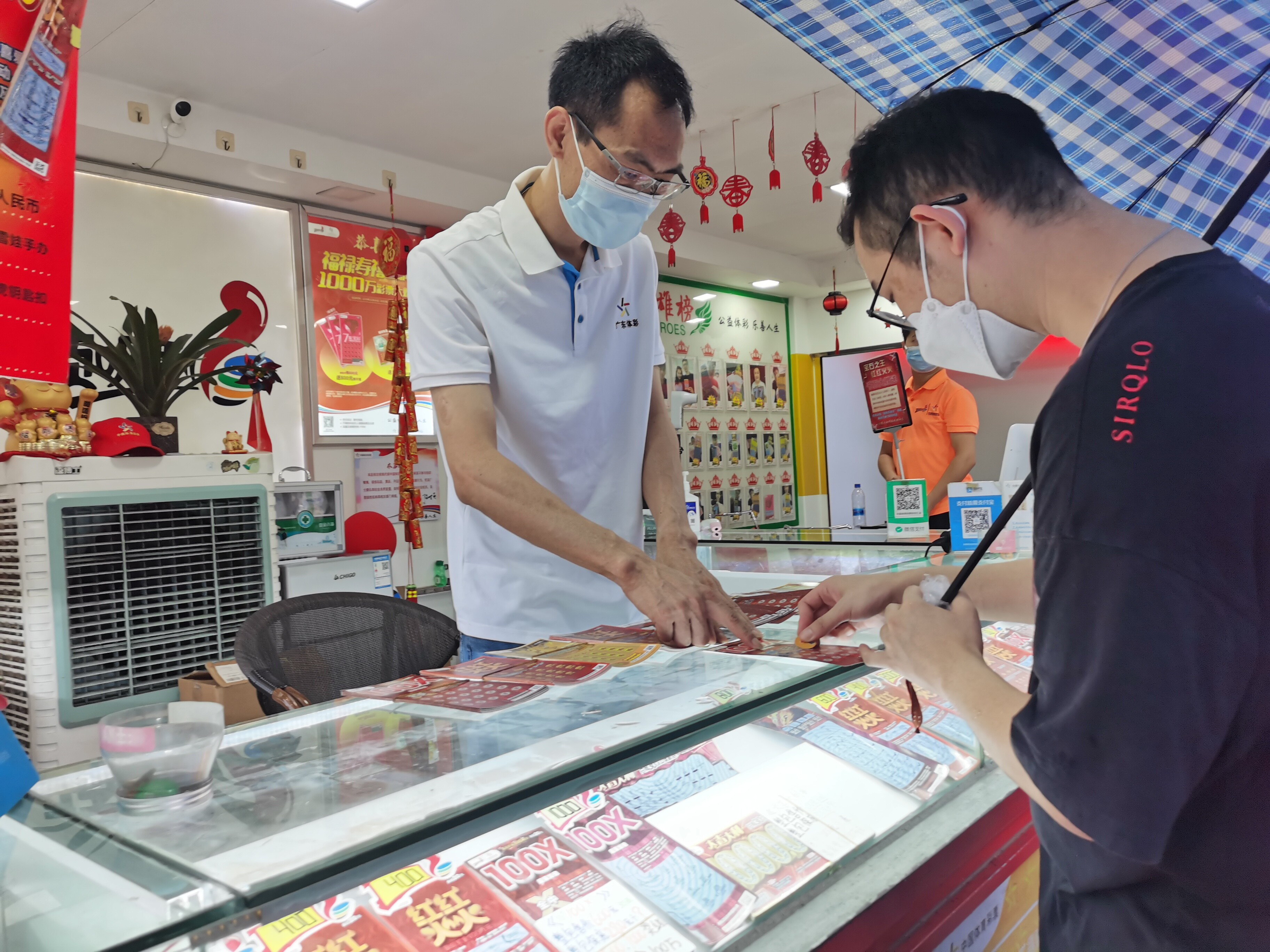 6月14日,羊城大雨,在位于广州市白云区安华汇广场一家户外即开票销售实体形象店,红黄相间的色调搭配“中国体育彩票”标志格外引人注目,不时仍有撑着雨伞的群众前来购彩,该店代销者总是微笑地跟不同购彩者讲述即开票中奖规则、体彩的公益性……这位代销者其实不简单,他叫桂叶飞。