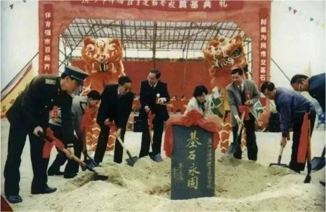 1995年,时任广州市副市长姚容宾(右四)、广东省体委副主任张法(右三)、广州市体委党委书记招务雄(左三)、广州市体委主任辛传铿(右一)等有关领导同志参加奠基典礼