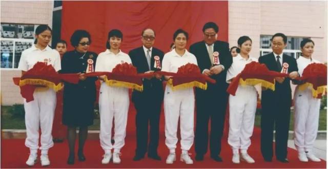 1996年10月28日,时任广州市委书记高祀仁(右四)、广州市市长林树森(右二)和捐建伟伦体校的恒生银行董事长利国伟夫妇(左二、左四)共同为伟伦学校落成剪彩
