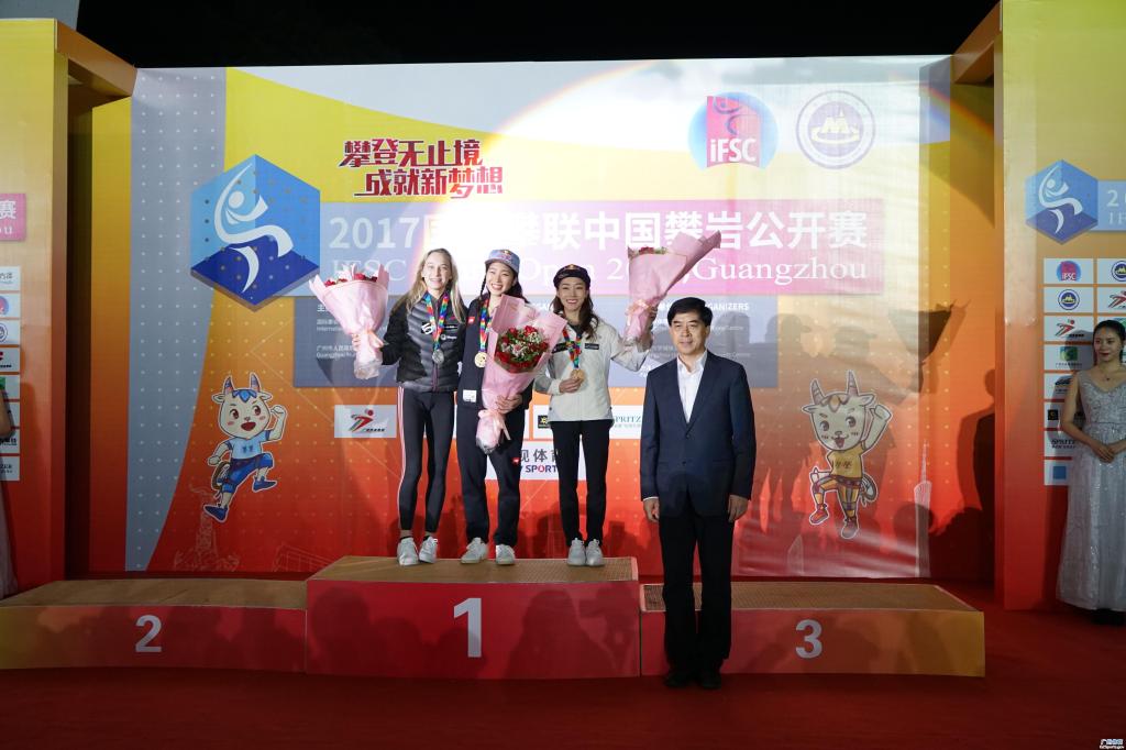 11月19日, 由国际攀岩联合会、广州市人民政府主办,国家体育总局登山运动管理中心、中国登山协会、现场比分 承办,广州市体育竞赛中心、广州大学城体育中心协办的2017国际攀联中国攀岩公开赛精彩圆满在广州大学城体育中心攀岩场落下帷幕。组委会主任、国家体育总局登山运动管理中心主任、中国登山协会主席李致新, 广东省体育局局长王禹平,组委会常务副主任、广州市政府副秘书长张建华,组委会常务副主任、现场比分 局长罗京军和国际攀联主席马尔科等为6个项目获得前三名的运动员颁奖。