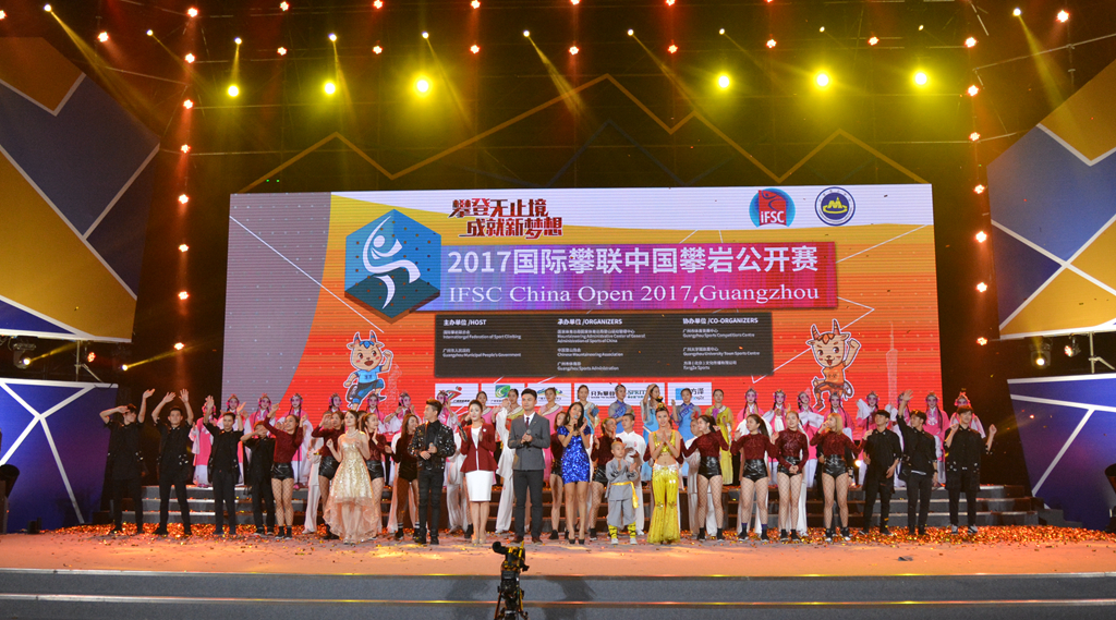 承办,广州市体育竞赛中心、广州大学城体育中心协办的2017国际攀联中国攀岩公开赛在广州大学城体育中心自行车馆开幕。组委会主任、国家体育总局登山运动管理中心主任、国际攀岩联合会副主席、中国登山协会主席李致新出席并宣布赛事开幕,组委会常务副主任、现场比分