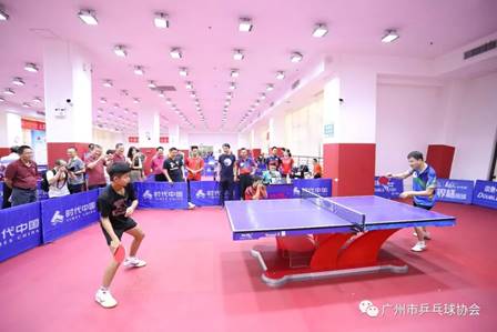 △广州市人大常委会主任陈建华与民同乐,与时代中国董事局主席岑钊雄先生以及获得2019年全国少儿乒乓球(南方赛区)男子单打冠军选手、由广州市乒乓球协会和广州国际乒乓球中心培养的未来之星敖华磊友谊比赛中。