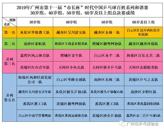 经过11个分区预赛及总决赛为期四个多月的激烈鏖战,各区各组别冠军队伍汇聚一堂,本届“市长杯”最后4个年龄组别的名次也相继决出。从化区华软教工队、越秀区吴川建安队、越秀区东体一队、白云区汇民中西医结合医院队分别夺得30岁组、40岁组、50岁组、60岁及以上组冠军。特此祝贺。