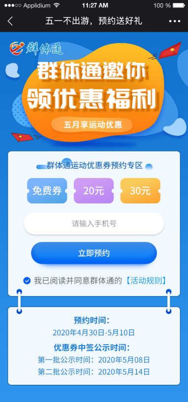 伴随着市内多处体育场馆的逐步恢复,“群体通”全民健身服务平台也在5月份推出了运动优惠礼包预约活动,为广大市民提供20000份运动礼包,鼓励市民在崭新5月,重新投入体育锻炼,增强身体免疫力。市民可在4月30日至5月10日,通过“群体通”APP参与预约,就有机会获得价值约150元的运动优惠礼包(内含免费券1张、20元订场优惠券一张、30元订场优惠券一张)。本次活动的20000份运动礼包将于5月8日、14日分两批派发,并通过短信通知中签市民。
