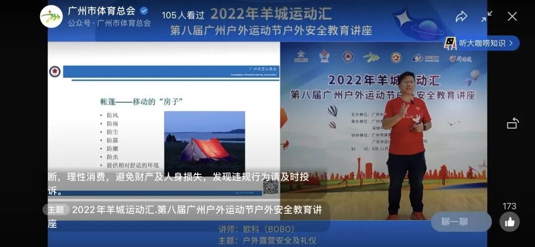 日前,户外安全教育讲座第五期于线上顺利开讲,至此,2022年羊城运动汇·第八届广州户外运动节户外安全教育计划系列讲座圆满结束。讲座均以线上直播的方式分期举办,围绕“户外安全”系列主题,邀请业内专家、大咖讲解户外常见的危险以及应急处置方法,帮助户外运动爱好者成为达人玩家,开讲以来受到广大户外运动爱好者的好评,成为大家学习户外风险防控、危机应急处置的行动指南。