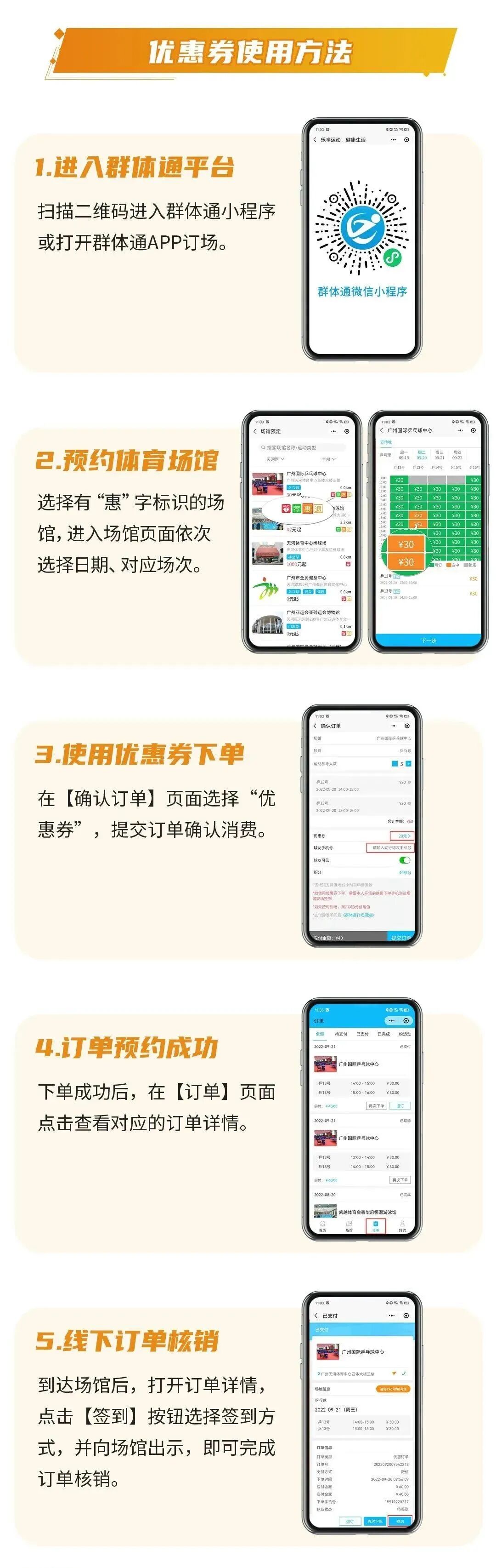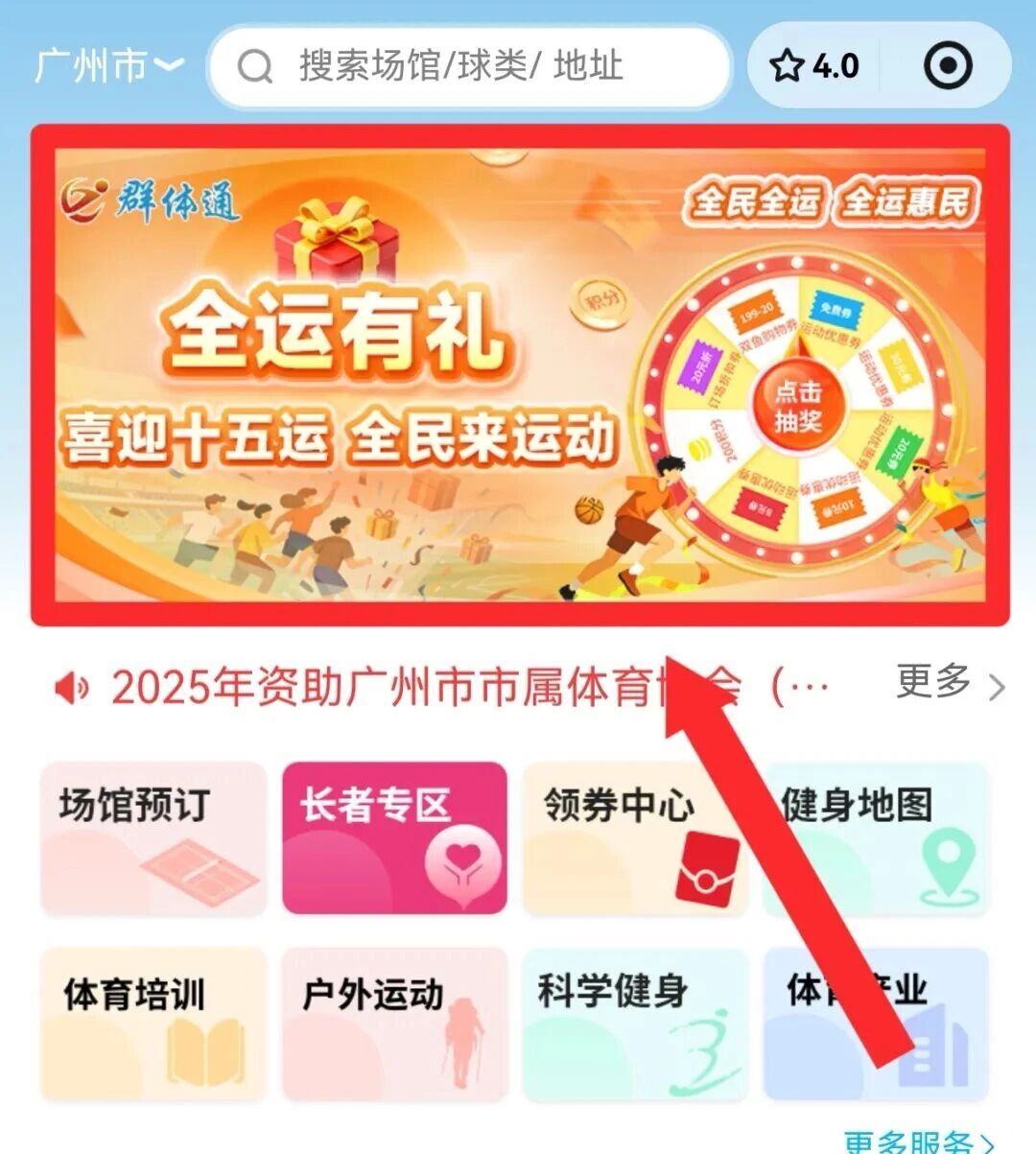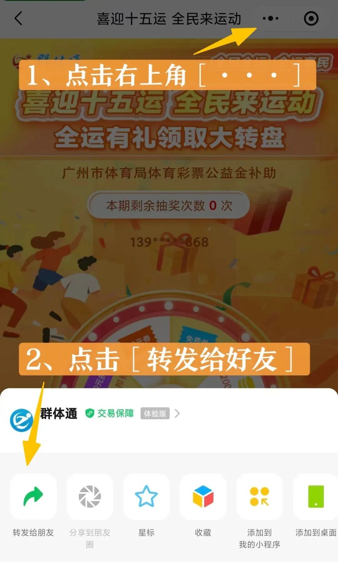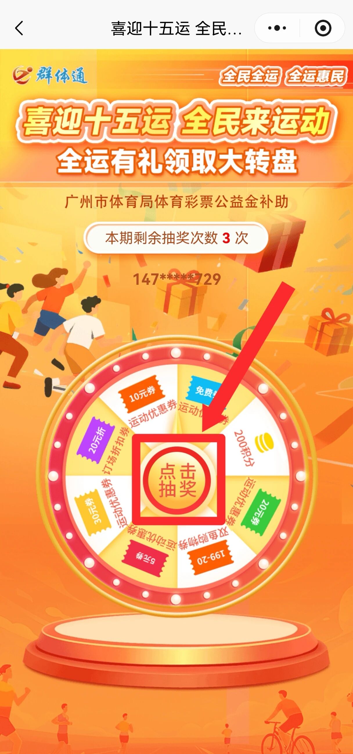 进入活动页面,获取转盘抽奖机会。 (活动二维码) 2.新用户须先进行微信“用户授权使用”,选择绑定用户手机号,完成用户注册。进入活动转盘页面,每位用户有3次抽奖机会,“点击抽奖”,可随机获得各类优惠券或积分。 3.在小程序页面点击右上角【···】,将活动信息转发给好友群,可额外增加1次抽奖机会。 二、用券指南 三、活动须知 用券须知: 1.优惠券自领取之日起有效期14天,逾期失效。 2.每次订场限用1张优惠券,凭券线上预订有“惠”字标记的广州市社会场馆,可获得相应金额减免优惠。免费券最高可抵用60元。 3.优惠券仅限本用户使用,不可转让、不找零、不兑现,不得用于商业用途,一经发现则将账号进行冻结处理,并追究相关责任。 4.公共体育场馆提供免费、低收费开放服务,以公布的时段价格为准,不适用优惠券。 退订须知:已成功预订但因个人原因不能到场运动的用户请主动联系场馆进行退订,无故爽约者将扣减其个人信用值并限制不能继续在平台享受优惠。 安全须知:市民应在身体状况允许下科学开展运动健身,注意防晒、补水,谨防中暑,避免不必要的运动伤害。 如有疑问,可在微信公众号留言,群体通小程序/APP-【帮助与反馈】留言(24小时)或致电020-38780570、38780867(上午9:00—12:00;下午14:00—18:00)进行咨询。 激情全运会 活力大湾区 魅力新广州 喜迎十五运 全民来运动 为全运喝彩 为广州加油