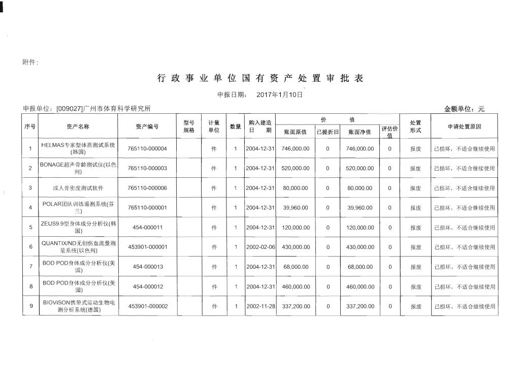 为加强国有资产管理,保证资产安全有效使用,广州市体育科学研究所申请对一批体质监测专用设备作报废处置,报废资产账面价值2,801,160元(详见附件),现根据《广州市市属行政事业单位国有资产处置办法》(穗财资〔2012〕327号)有关规定予以公示,如有疑问请向市体育局计划财务处反映。