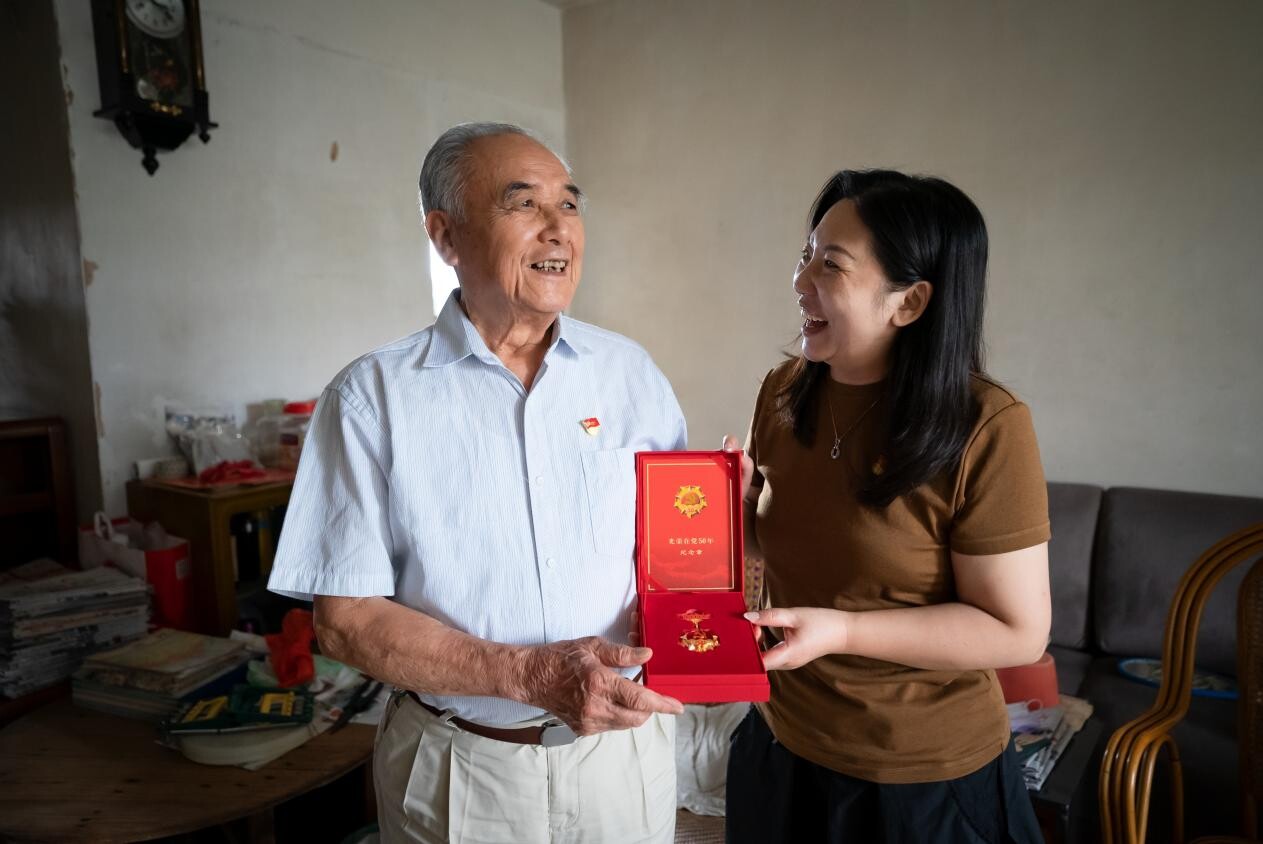 (图为走访慰问老党员彭福信并送上“光荣在党50年”纪念章)