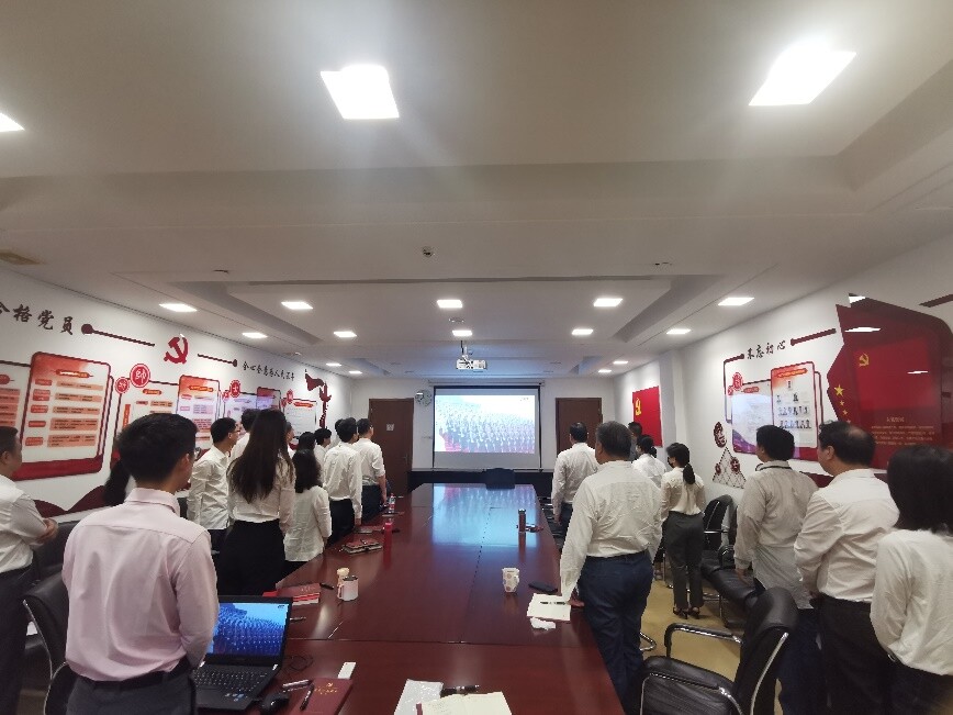 随着庄严肃穆的国旗徐徐升起,全体人员起立,以饱满的精神状态和嘹亮的声音高唱国歌。习近平总书记在庆祝大会上发表重要讲话,系统回顾了中国共产党建党百年的光辉历程,高度概括了中国共产党百年取得的伟大成就,庄严宣告全面建成小康社会,展望中华民族伟大复兴光明前景,向全体共产党员发出号召,在新征程的“赶考”路上,要牢记初心使命,坚定理想信念,践行党的宗旨,永远保持同人民的血肉联系,始终和人民想在一起、干在一起,风雨同舟、同甘共苦,努力为党和人民争取更大光荣。