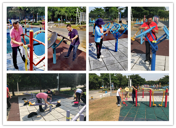 座谈结束后,按照中心党总支“一支部一特色”工作部署,体育场管理部、自行车和极限运动管理部联合党支部组织全体参会党员到中心P3停车场附近的惠民健身路径开展健身设施维护保养和清洁志愿服务。此处健身路径共有各类健身设施设备65台,是我中心向市民提供惠民健身服务的重点区域之一,也是居住在大学城内的市民群众常来的休闲健身场所。大家顶着烈日,有的负责给健身设施做“健康检查”,查看登记健身设施损坏情况;有的负责给健身设施除锈、上润滑油,让健身设施保持良好使用状态;有的则负责清扫健身路径周围的垃圾,营造一个干净整洁的运动健身环境。