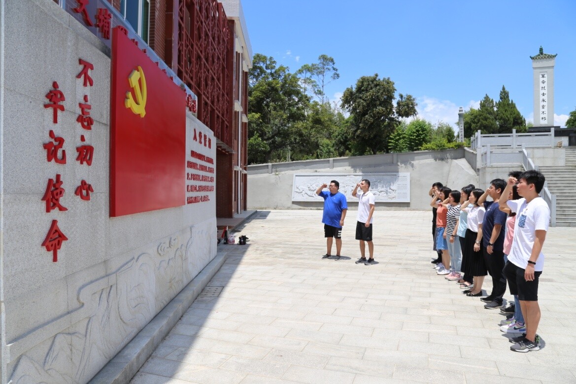 通过参观大埔围村抗战历史纪念馆和观看东江纵队成立发展历史短片,珠泳党员们了解到大埔围村曾是东江纵队的抗日游击根据地,当年为了保护游击队和家园,村民团结一致抗击侵略者,不少人为此英勇牺牲,如今斯人已往,唯留革命精神永垂不朽。在庄严肃穆的氛围中,党员面向党旗肃立,举起右拳重温入党誓词;瞻仰革命烈士纪念碑,鞠躬默哀行礼,对为保家卫国、抗日锄奸而牺牲的大埔围村村民和共产党员们致以崇高的敬意。