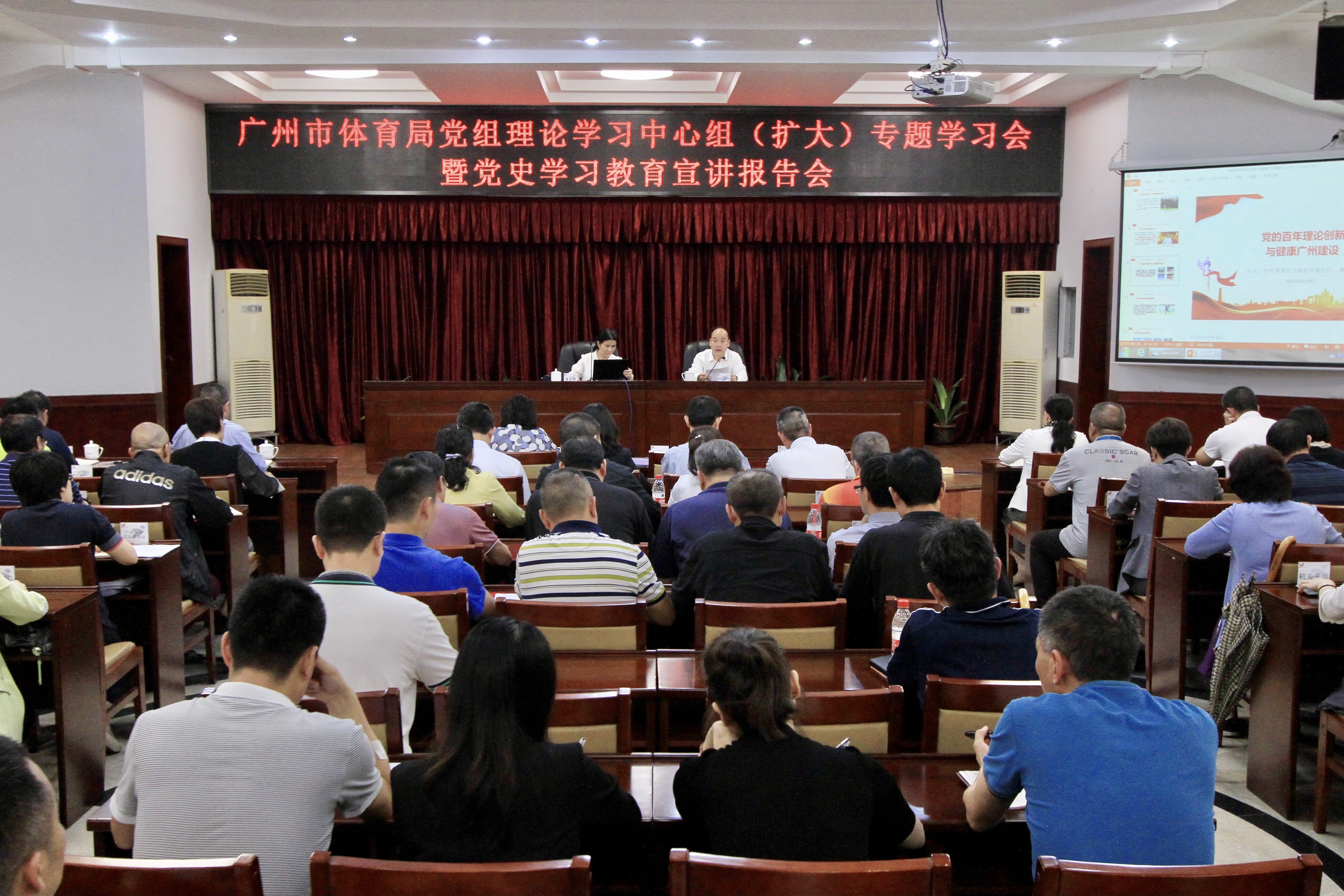 4月28日下午,市体育局召开党组理论学习中心组(扩大)专题学习会暨党史学习教育宣讲报告会。市委宣讲团成员、市委党史文献研究室主任黄小晶同志作题为《党的百年理论创新与健康广州建设》的专题宣讲。局党组书记、局长欧阳资文主持会议,局领导班子成员、局属单位领导班子成员、广州市足球协会党支部临时负责人以及局机关全体干部共90余人参会。